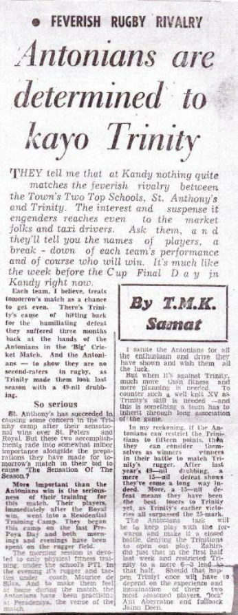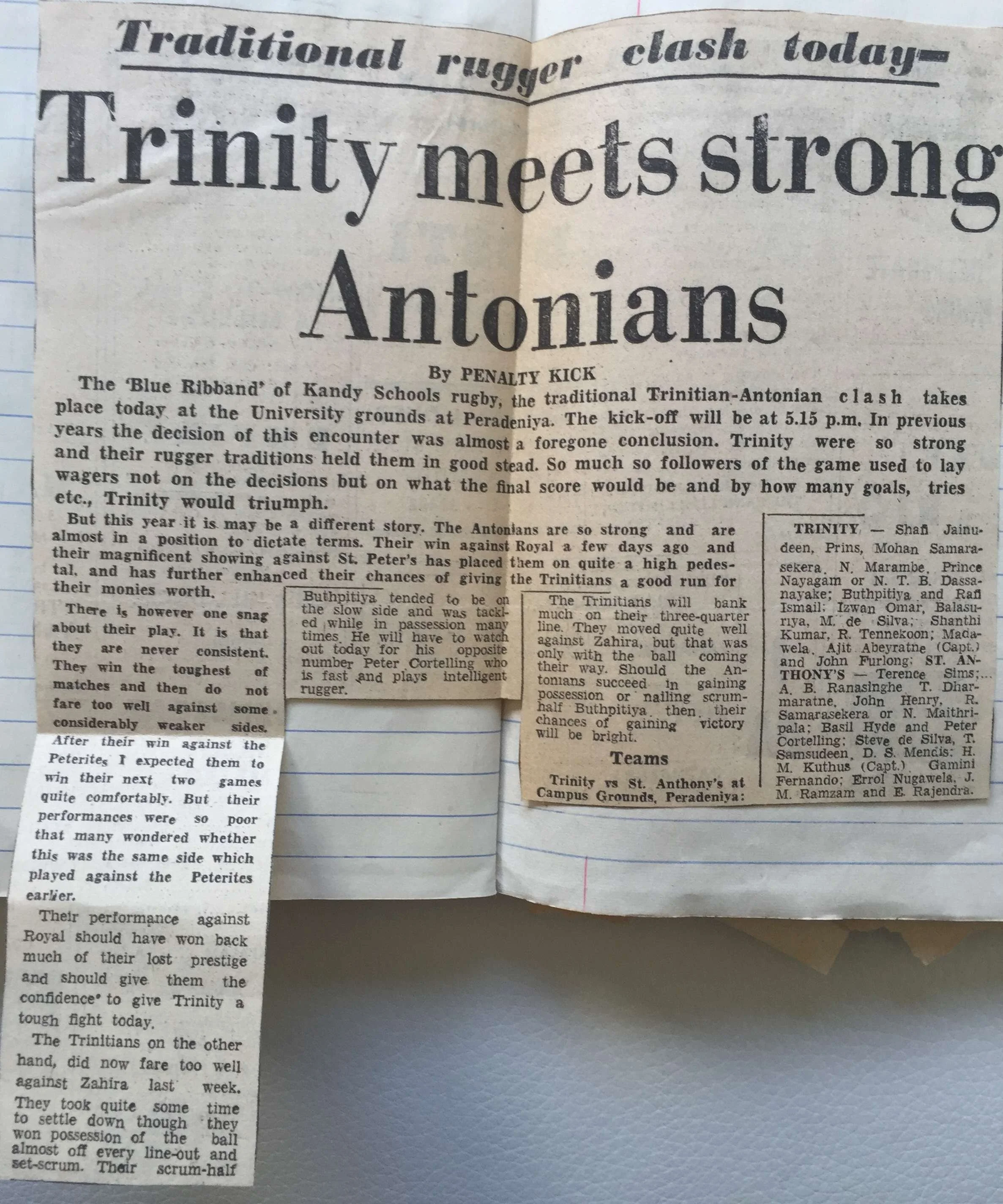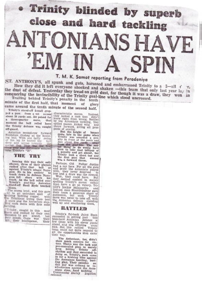 Meri continued: “Trinity, meanwhile, had recorded emphatic victories over Wesley, St Joseph’s and Zahira, and as reported in the press—and even by the Trinitians themselves, who had promised a 72–nil drubbing—it was said that a 15-point loss would be considered a moral victory for the Antonians. The match at Peradeniya was played before a packed house and, after a bruising encounter, we emerged with a 3–all draw. St Anthony’s scored a try to Trinity’s penalty, becoming the first team to cross the Trinity line that year. We also recorded convincing wins over St Thomas’ and St Joseph’s during the season.”